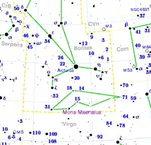 Mons Maenalus (Latin for Mount Maenalus) was a constellation created by Johannes Hevelius in 1687. It was located between the constellations of Boötes and Virgo, and depicts a mountain in Greece that the herdsman is stepping upon.[1] It was increasingly considered obsolete by the latter half of the 19th century.[2] Its brightest star is 31 Boötis, a G-type giant of apparent magnitude 4.86m.