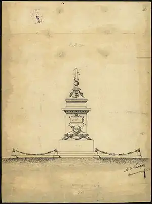 The monument is 13 m high, made of grey Balkan granite and designed by Czech architect Antonín Kolář. The bronze bas-relief of the head of Levski, part of the monument, was created by Josef Strachovský (or, according to other sources, Austrian sculptor Rudolf Weyr), whereas Italian Abramo Peruchelli did the stonecutting work. It was inaugurated on 22 October 1895, but was planned and worked on ever since the Liberation of Bulgaria in 1878, the construction being hindered by a chronic lack of funds and negligence, and taking a whole 17 years. This ignited a wave of indignation among the Bulgarian intellectuals of the time, with the poet Konstantin Velichkov even branding this carelessness in an 1881 poem (see text).