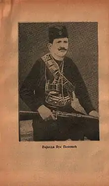 Popović was born in 1881 in Sjenica, Kosovo Vilayet, Ottoman Empire (present-day southwestern Serbia). His family fled from Ottoman rule and settled in Kragujevac, where he attended school. After graduating from the Military Academy in Belgrade in 1903 with the rank of infantry second lieutenant, Vojin Popović chose to join the Chetnik organisation in 1905, and in 1911 joined the secret organization "Unification or Death" (Black Hand). He fought against the Ottomans in Macedonia and Old Serbia between 1905 and 1912 (battles at Čelopek, Кumanovo, Prilep, Bitola, and the bank of the Vardar) and against the Bulgarians on the river Bregalnica in 1913. He won military renown in the First World War battles of the Drina, the Коlubara and particularly for Cer, and was decorated with the Order of the Кarađorđe Star, 4th and 3rd class (officer and commander). He was promoted to the rank of infantry lieutenant colonel of the Serbian Army, and despite his reputation of being a strict and unbendable officer, he was favoured with complete trust. He was remembered above all as the most exemplary Chetnik leader (vojvoda) because of his exceptionally courageous and inspirational military leadership. His units provided security for Crown Prince Aleksandar Karađorđević during the withdrawal across Аlbania which ensued after the heavy losses Serbia suffered in 1915. In the winter of 1916 he commanded the volunteer detachment engaged in battle with Bulgarians over the strategic peak of Mt Nidža, Kajmakčalan, on the Salonika front. He was wounded at Grunište vis in the River Crna area, but continued to pursue the enemy. On 29 November 1916, at the final stage of the battle, he died of a bullet to the heart.[1]