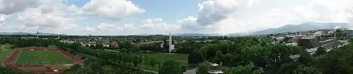 Mooswald is a district in the western part of Freiburg im Breisgau, Germany, which consists of the two districts Mooswald West (521) and Mooswald East (522). Its population is 9,223 (2020).[1] In the North East, Mooswald borders the district of Brühl, with its airfield, the university campus of the technical faculty and the exhibition centre. Mooswald further borders the district of Landwasser in the North West, the district of Stühlinger in the East and the district of Betzenhausen with the Seepark in the South West. Mooswald is separated from Brühl by the Breisgau S-Bahn, from Landwasser by the Westrandstraße (Paduaallee/Mooswaldallee) and from Stühlinger by the railway tracks of the freight railway.