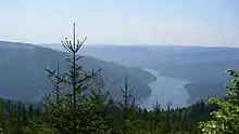 Smrk, with a height of 1,276 m (4,186 ft), is the second highest summit of the range. Its northern slope steeply rises from the surrounding lowlands and is separated from the rest of the mountains by the deep Ostravice River (in the east) and Čeladenka (in the west) river valleys; in the south, it merges in the lower Zadní hory (i.e. Rear mountains) area.
