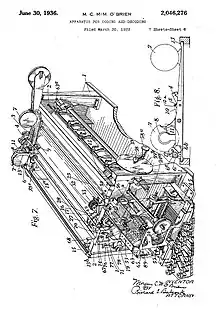 In April 1928, Morgan O'Brien applied for a patent "Improvement in or relating to Means or Apparatus for Encoding and De-Coding Messages" (GB320315,[7] US 2046276[8]). This was a remarkably complex typewriter style cipher device, and unlike anything that Morgan had patented before. It attracted the attention of official sources who funded the building of 3 machines for test – one for each of the armed services. There was also interest from America where the U.S. Navy's cipher expert, Lieutenant J.N. Wenger, said it created a "tremendously long and complex cipher". He had recently reviewed Enigma and could see that the O'Brien system offered vastly more "starting points" than Enigma.[1] W. Watson & Sons Ltd, a leading instrument maker, built the prototypes. The prototypes weren't complete until Autumn 1931, and there were teething troubles that revealed the machines to depend on "absolute accuracy of the timing, registering or meshing of certain parts". This let to problems with the prototypes, and in-spite of continued development and a further patent in 1935 (GB453660[9]), it appears to be this that ultimately led to the failure to secure orders, although there were some commercial difficulties also.