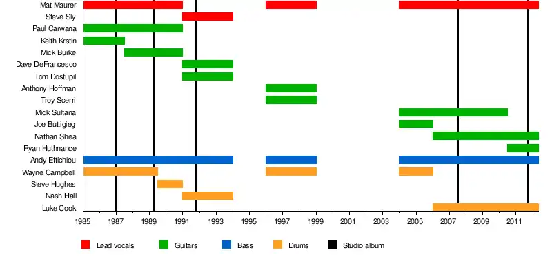 Mick Burke, guitarist from 1987 to 1990, died on 24 August 2017. His death was reported on the band's Facebook page.[5]