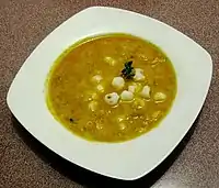 In Ecuador, "mote" refers to corn kernels that have been boiled and cooked, which are served peeled. They often accompany popular dishes such as hornado and fritada. They are used in many soups, including caldo de patas. It is also the main ingredient in dishes typical of the city of Cuenca, such as mote pillo, mote sucio and mote pata.[2]