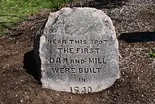 A stone from 1886 marking the location of the first mill built on Mother Brook
