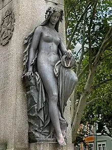 The pairing of a male statue representing the river Rhine with a female statue representing one of its tributaries was something of a local tradition in the 19th century. The two pairs on the railway bridge are lost, but a third pair, personifications of Rhenus and Mosella, can still be seen today in Strasbourg's Neustadt (see gallery below).[6]