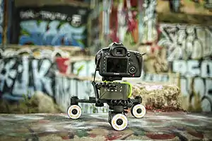 Motion control photography is a technique used in still and motion photography that enables precise control of, and optionally also allows repetition of, camera movements. It can be used to facilitate special effects photography. The process can involve filming several elements using the same camera motion, and then compositing the elements into a single image. Other effects are often used along with motion control, such as chroma key to aid the compositing. Motion control camera rigs are also used in still photography with or without compositing; for example in long exposures of moving vehicles.[1][2] Today's computer technology allows the programmed camera movement to be processed, such as having the move scaled up or down for different sized elements. Common applications of this process include shooting with miniatures, either to composite several miniatures or to composite miniatures with full-scale elements.