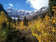 The rock which forms the visible surface of Mount Timpanogos is primarily limestone composed of compacted sediment laid down onto an ancient seafloor over millions of years during the late Carboniferous Period (roughly 300 million years ago).[7][8] Older rock exists beneath the limestone on the surface. The limestone was subsequently lifted high above sea level and the mountain itself became prominent as the Western valley sunk due to basin and range faulting.[9] The most contemporary features of the mountain were formed through recent glacial and water erosion.
