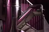 The parking garage contains parking spots for 480 cars. The space has up to 16 m high ceilings, and the underside of each level of apartments is covered in aluminum painted in a distinctive colour scheme of psychedelic hues which, as a tribute to Danish 1960s and '70s furniture designer Verner Panton, are all exact matches of the colours he used in his designs. The colours move, symbolically, from green for the earth over yellow, orange, dark orange, hot pink, purple to bright blue for the sky.[2] Besides being a sloping podium for the residential units to sit on, maximizing sunlight and views, the central garage space also serves as an atrium containing the building's circulation, affording the only access to the apartments. A set of metal stairs climb through the main space over the parking lot, providing access to the hallways across suspended industrial-looking metal-clad concrete connections, while a Swiss-manufactured, ski lift-style inclined elevator moves along the wall of the garage. Each level's hallway is enclosed and encased in painted metal both on the interior and exterior, colored according to floor in the same hues used in the main space.