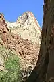 Mountain of Mystery is a 6,565-foot (2,001 m) Navajo Sandstone summit located in Zion National Park, in Washington County of southwest Utah, United States.[4] Mountain of Mystery is situated above The Narrows, towering over 2,100 feet (640 meters) above the floor of Zion Canyon and the North Fork Virgin River which drains precipitation runoff from this mountain. This peak rises above Orderville Canyon on its north side, and Mystery Canyon on the south. Its neighbors include Mount Majestic, Cathedral Mountain, Observation Point, Cable Mountain, Angels Landing, and The Organ. This feature's name was officially adopted in 1934 by the U.S. Board on Geographic Names.[4] The first ascent via the Northeast Buttress was made 15 September 2001, by Brian Cabe and Tom Jones.[5]