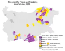 However, these movements, as well as the National Movement for Rights and Freedoms, member of a Social-Democratic coalition ('Rose coalition') failed to secure any elected representative in the parliament. A party founded in 2011 by members who left the party and headed by Korman Ismailov—People's Party Freedom and Dignity, gained 1.5% of the vote in a coalition with National Movement Simeon II (NDSV) and therefore did not cross the 4% threshold to enter the parliament.[13] This party was part of the Reformist Bloc and crossed the threshold and entered the parliament and the government in 2014, but only with one Deputy Minister that was removed. Another political fraction DOST founded by the former leader Mestan, had 17,000 registered members in 2016, which were obtained only for about one year.[14] If so, the members of the Movement of Rights and Freedoms must have dropped in numbers.
