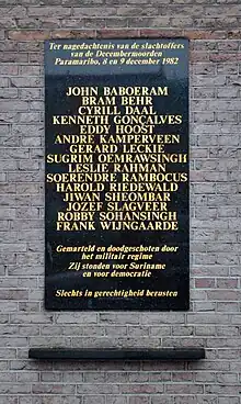 On 8 December 1992, the tenth anniversary of the December murders, a plaque was placed on the side wall of the Mozes en Aäronkerk in the memory of fifteen victims who were arrested, tortured and murdered without a trial by the soldiers loyal to Dési Bouterse, then the dictator of Suriname.[24][25]