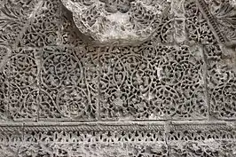 There has been much discussion of the fact that the decoration on the left side of the facade contains many animals among the foliar forms, while on the right of the entranceway in the centre there are no animals. It has been suggested that this is because the right-hand side was the outside wall of the mosque.[1]