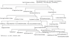 ![]() Multituberculate phylogenetic tree[27] Based on the combined works of Mikko's Phylogeny Archive[28] and Paleofile.com. Suborder †Plagiaulacida Simpson 1925