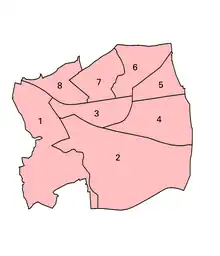 The electoral wards used in the Municipal Borough. 1. Abbey 2. Gascoigne 3. Eastbury 4. Cambell 5. Parsloes 6. Manor 7: Longbridge 8: Park