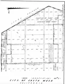 On March 25, 1947, a petition was presented to the Orange County Board of Supervisors to incorporate Costa Mesa as a city.[3] Following a public hearing, an election was set to be held on October 7 to determine whether the city shall become incorporated and filling the offices of five city council members, one city clerk, and one city treasurer.[4]