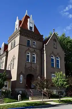 The Munson Building is a historic building located in Independence, Iowa, United States. The Late Victorian French Renaissance style building was built in 1893.[2] The three-story brick structure is composed of two symmetrical units that form an asymmetrical structure. It has a four sided tower that is capped with a pointed tile roof and features decorative tin work. The building was named for Perry Munson, a local businessman who was a machinist and blacksmith by trade, who bequeathed $5,000 for its construction. The building housed a variety of programs geared toward the community's youth. They were trained in mechanical arts such as printing, drafting, and woodworking. It also housed the Y.M.C.A., public library, Boy Scouts, Girl Scouts, and other community groups. The building was listed on the National Register of Historic Places in 1976.[1]