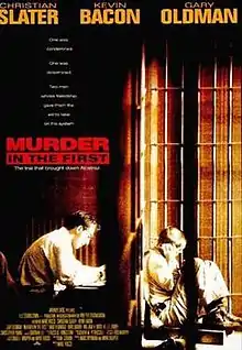 Murder in the First is a 1995 American legal drama film, directed by Marc Rocco, written by Dan Gordon, and starring Christian Slater, Kevin Bacon, Gary Oldman, Embeth Davidtz, Brad Dourif, William H. Macy, and R. Lee Ermey. It tells the alternate history of a petty criminal named Henri Young who is sent to Alcatraz Federal Penitentiary and later put on trial for murder in the first degree as the lawyer representing him recounts Henri's life and when he represented Henri. This film was described on the movie poster as "the case that took down Alcatraz". The film received a mixed critical response, although Bacon's performance was praised by critics.