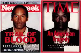 On June 27, 1994, Time published a cover story, "An American Tragedy", with a photo of Simpson on the cover.[132][133] Time's cover image was darker than a typical magazine cover and darker than the original photo, as shown on a Newsweek cover released at the same time. Time consequently became the subject of a media scandal.[134] Commentators found that its staff had used photo manipulation to darken the photo, and they speculated it was to make Simpson appear more menacing. After the publication of the photo drew widespread criticism of racist editorializing and yellow journalism, Time publicly apologized.[135][132][136]