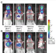 Inbred and outbred mouse and rat strains have very different susceptibility to Sendai virus infection. Visualization of SeV infection in live animals demonstrates this difference.[27] The 129/J mice tested were approximately 25,000-fold more sensitive than SJL/J mice.[28] C57BL/6 mice are highly resistant to the virus, while DBA/2J mice are sensitive.[29] C57BL/6 mice showed slight loss of body weight after SeV administration, which returned to normal later. Only 10% mortality rate was observed in C57BL/6 mice after the administration of very high virulent dose of 1*105 TCID50.[30] It was shown that resistance to the lethal effects of Sendai virus in mice is genetically controlled and expressed through control of viral replication within the first 72 hours of infection.[29] Treatment of both strains with exogenous IFN before and during viral infection led to an increase in survival time in C57BL/6 mice, but all animals of both strains ultimately succumb to SeV caused disease.[31] If a mouse survives a SeV infection, it develops a lifelong immunity to subsequent viral infections.[32]