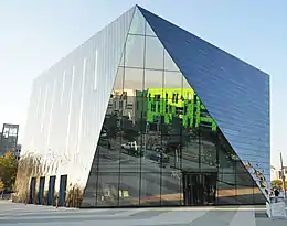 The architectural design integrates the museum within the surrounding Uptown and encourages an interaction through the building's façade.[27][28] From the ground floor the moCa is accessible along all sides of the façade with the main entrance positioned facing east and overlooking Toby's Plaza (designed by the American architectural firm James Corner Field Operations).[29] The project reflects the ethos of the museum and as described by Moussavi is “designed to serve as a public ‘living room’ in a cosmopolitan Cleveland neighbourhood... (acting) as a catalyst for creativity and growth for the city”.[30] The materiality of the building translates an idea of the creative motivations of the Museum of Contemporary Art Cleveland with Moussavi describing the reflective black stainless steel of the exterior as a decision to allow a play of sunlight and mirroring of the surrounding plaza.[31] The designer relies on the use of reflective surfaces and shifting interior walls to create a physicalisation of the museum's multiple identities, as both gallery and event space.[32] The use of an electric blue wall and ceiling paint throughout the gallery spaces was chosen by Moussavi to enhance the display of the artworks.[33][34] The consistent blue interior surfaces throughout the museum acts in a redefinition of the traditional ‘white-cube’ gallery setting.[35]