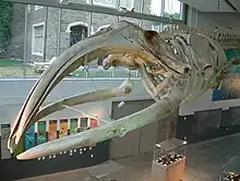 North Atlantic Right Whale #2030 was killed after becoming severely entangled in fishing gear in May 1999. Rescuers attempted to free her, but she fought them off, swimming hundreds of miles before ultimately succumbing to her injuries.[6] Director Warren D. Allmon expressed interest in acquiring the skeleton after being notified on October 21, 1999 by the National Marine Fisheries Service that the 44-foot (13 m) right whale had been spotted dead off the coast of Cape May, New Jersey.[4]: 92 PRI was informed that they could take the skeleton if they assisted with flensing the 30-ton carcass. Three days later, the bones arrived at PRI,[7] where they were buried in a bed of horse manure for several months in order to remove the remaining flesh and oil. After cleaning, North Atlantic Right Whale #2030 was mounted on a steel armature in a greenhouse on-site. The museum building was left open on the northeast end so that the whale could be brought through for installation. In November 2002, the skeleton was transported into the building via crane and mounted in the atrium lobby.[8]