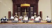 One of the traditional music forms is Pinpeat (Khmer: ពិណពាទ្យ), in which an orchestra or musical ensemble performs the ceremonial music of the royal courts and temples of Cambodia. The royal orchestra would accompany the classical ballets, both male (Lokhon Khol) and female (Apsara), as well as the Grand Theater of Shadows, the Sbek Thom.[5] The orchestra consists of approximately nine or ten instruments, mainly wind and percussion (including several varieties of xylophone and drums). It accompanies court dances, masked plays, shadow plays, and religious ceremonies. The pinpeat is analogous to the piphat ensemble of Thailand.[6]