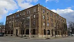 The Muskegon YMCA Building is a four-story building constructed of blond brick with limestone trim. The building exterior displays a collection of Art Deco styling overlaid with Late Gothic Revival ornamentation. The front facade is seven bays wide with balanced massing and window openings. The main entryway is in the center bay, framed by Gothic-inspired side piers and capped with a limestone block bearing the name of the building. The bays to each side contain rounded arch windows. A molded limestone bandcourse runs across the top of the first floor. The second and third floors are connected visually by limestone bandcourses and brick piers. The fourth floor is separated from the third by a limestone bandcourse.[2]