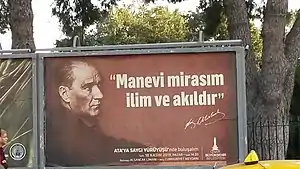 Atatürk's cult of personality was started during the life of Mustafa Kemal Atatürk[1] and continued by his successors after his death in 1938, by members of both his Republican People's Party and opposition parties alike,[2] and in a limited amount by himself during his lifetime in order to popularize and cement his social and political reforms as a founder and the first President of Turkey.[3] The cult has been compared to the personality cults of the Soviet Union,[4] and has been described as "the most grotesque state-sponsored cult of personality outside North Korea".[5] It ultimately serves the interests of the Turkish army, which, for at least half a century, was the main political force in the country notwithstanding Turkey's façade of multiparty parliamentary government.[6]