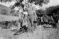 Aboriginal stockmen played a large part in the life of Top End cattle stations. These men and women were splendid stockmen and were an integral part of the musters. Mustering in the Top End is conducted during the dry season from April to September when additional stockmen will be employed for the purpose. Initially, mustering here involved having stock camps where about three to seven ringers under a head stockman or overseer rode out with the horses to the area to be mustered. The musterers started early each day by bringing up the hobbled horses, saddling up and then spending a long day mustering, branding, castrating and drafting the cattle. These long days were hard on man and beast with each having to contend with the heat, dust and flies. The men endured camping on the ground and had a monotonous diet of meals that were cooked on an open fire, usually by an unskilled cook.[3]