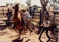The seasonal mustering of cattle with horses is still very important in remote country and the stockmen will spend long days riding and camping in isolated areas. When cattle have to be castrated or ear marked in country that is too remote from fenced-in areas ("yards"-Au, "corrals"-US), they have to be thrown. This is accomplished by various methods. In the US, roping the animal and tying up its legs once thrown is a common method. In Australia, the common method is getting the beast off balance either with the pressure of a horse or in open country with a vehicle. Lighter beasts may also be thrown by holding the tail to pull them off balance. When downed the beast may have its back legs hobbled if it is too big to hold otherwise.[3] In South America, the animal is often tripped with a bola and then hobbled or tied once down.