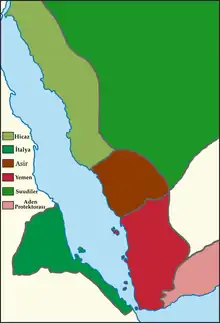 There are various sources about the etymology of Yemen. The term Yamnat is used in ancient South Arabian inscriptions to refer to the second Himyarite king. It is mentioned in the title of Shammar Yahrish. This term probably refers to the coastline between Aden and Hadhramaut.[3][4] Historically, Yemen encompassed a larger region stretching from northern Asir in Saudi Arabia to Dhufar in southern Oman. This region is called Greater Yemen.[5][6]