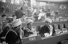 The Mutawakkilite Kingdom of Yemen (Arabic: المملكة المتوكلية اليمنية, romanized: al-Mamlakah al-Mutawakkilīyah al-Yamanīyah), also known as the Kingdom of Yemen (Arabic: المملكة اليمنية, romanized: al-Mamlakah al-Yamanīyah) or simply as Yemen, or, retrospectively, as North Yemen, was a state that existed between 1918 and 1962 in the northwestern part of what is now Yemen. Located in the Middle East, the Kingdom of Yemen had an area of 195,000 km2. The country was bordered by Saudi Arabia in the north, and the Aden Protectorate to the south. Its capital was Sana'a from 1918 to 1948, then Taiz from 1948 to 1962.[1] From 1962 to 1970, it maintained control over portions of Yemen until its final defeat in the North Yemen Civil War. Yemen was admitted to the United Nations on 30 September 1947.[2]