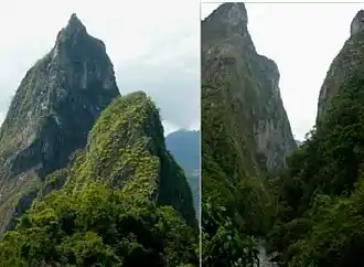 The two mountain peaks Fura and Tena, bordering the Carare River, were considered sacred by the Muzo people and believed they were the parents of humanity, creation of Are.[10] Fura and Tena taught the Muzo agricultural techniques, craftwork, and tactics of war. The myth of Furatena tells about a man with blue eyes and blonde beard, Zarbi, who entered the Muzo territories looking for the Fountain of Youth. On this journey, he met the beautiful Fura and they got together. The husband of Fura, Tena, was outraged, killed Zarbi and hung his body on the Fura mountain. After this cruel act he killed Fura and committed suicide, giving birth to the two pointing hills. According to the Muzo legends, the tears of Fura turned into emeralds and butterflies.[11]