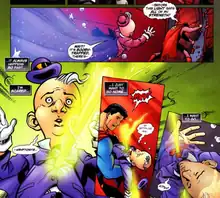 After the New 52 Superman died and Pre-52 Superman took his place by the time of the DC Rebirth reboot, a mysterious Clark Kent appeared claiming to be the real one.[16] Despite everyone's hesitations and the previous event that outed Clark as Superman, the new Clark had the medical records to match, and when Superman questioned Clark with a telepathic probe, Clark presented a clear history of Clark Kent as a human being who was orphaned at three months old and subsequently adopted by the Kents.[17][18] Pre-52 Lois investigates the new Clark more after getting her job back at the Daily Planet.[19] Clark asks Lois out on a date which she accepts, but on the date, Lois finds that Clark rented the whole place out for the night and proposed to her, scaring her out of the date.[20] He follows Lois to her secret home and finds out about her marriage to Superman and their son, Jonathan. The next day, after spotting Clark, Superman and Lois's house and Jonathan suddenly disappear.[21] They track Clark down to his apartment, where he reveals himself to be the pre-52 Mister Mxyzptlk, who was absent from the New 52 universe because he was held captive by Mister Oz and used his powers to transform and brainwash himself into believing he was Clark Kent to avoid getting recaptured after escaping. His attacks on Superman are revenge for failing to notice he has been missing and he proceeds to make Lois forget about her own son.[22] As even Lois forgets that Clark and Superman were the same person, Superman agrees to play Mister Mxyzptlk's game to try and win back the 'right' to see his son again, but although Mister Mxyzptlk attempts to change the rules and ensure his victory, Jonathan is able to fight through his Mister Mxyzptlk-created prison with the aid of unspecified spirits that are revealed to be the New 52 versions of Superman and Lois, culminating in the creation of a new timeline where the essence of the Post-Flashpoint Lois and Clark are fused with their Pre-Flashpoint selves, so that the history of both worlds can co-exist.[23]