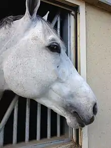 Mylord Carthago is a gray Selle Français stallion. He stands 1.71 m tall. According to Penelope, he's a horse who gives a lot to his rider, and wants to get ahead.[20] He is energetic, and has great style over jumps. He's also a very sensitive animal. The rider insists on his "kindness" and the quality of his mind, testifying that he has never refused to jump a fence, even in training. According to her, he is gifted with excellent learning faculties, an intelligence that is also evident in his dual career as a competitor and breeder.[21]