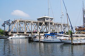 There have been three bridges at this location. The first bridge was a single-tracked, wooden drawbridge in 1819, which was replaced with a steel swing bridge in 1875.[1]