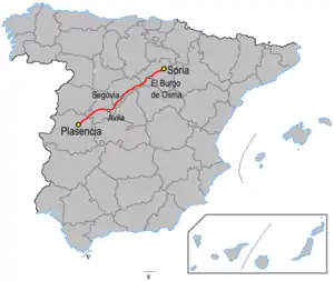After Ávila the road passes to Segovia along the northern flanks of the Sierra de Guadarrama. It passes over the Autopista AP-6 and N-VI. The Autopista AP-51 and Autopista AP-61 provides an alternative route.