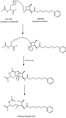 {{cite journal}}: CS1 maint: multiple names: authors list (link) - Andrea Armirotti, Elisa Romeo, Stefano Ponzano, Luisa Mengatto, Mauro Dionisi, Claudia Karacsonyi, Fabio Bertozzi, Gianpiero Garau, Glauco Tarozzo, Angelo Reggiani, Tiziano Bandiera, Giorgio Tarzia, Marco Mor & Daniele Piomelli (May 2012). "beta-Lactones Inhibit N-acylethanolamine Acid Amidase by S-Acylation of the Catalytic N-Terminal Cysteine". ACS Medicinal Chemistry Letters. 3 (5): 422–426. doi:10.1021/ml300056y. PMC 4025845. PMID 24900487.