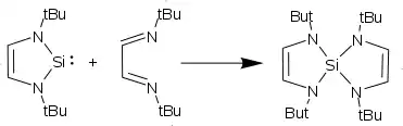 Dienes, as well as heterodienes including benzil or the common NHSi backbone N,N'-diterbutyl-1,4diazabutadiene ([tBuN-CH=CH-tBuN]) react in a [4+1] fashion to yield molecules with two five-membered rings sharing a single silicon atom.[2][4]