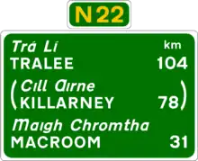 The N22 road is a national primary road in Ireland which goes through counties Kerry and Cork, from Tralee in the west through Killarney, Macroom and Ballincollig to Cork City in the east.