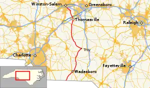 North Carolina Highway 109 (NC 109) is a north–south state highway in North Carolina. It primarily connects small towns in the central Piedmont region of the state. The 117-mile (188 km) route is a two-lane road for most of its length, but the segment between Winston-Salem and Thomasville is being upgraded to a divided 4-lane highway, as it is a major route between the two cities. The central segment of NC 109 passes through the Uwharrie Mountains and the Uwharrie National Forest.