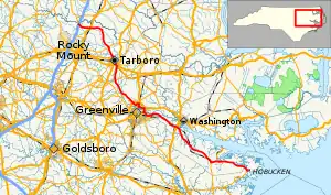North Carolina Highway 33 (NC 33) is a primary state highway in the U.S. state of North Carolina. Spanning a distance of 110 miles (180 km), the eastwest route passes through many small towns and communities in Eastern North Carolina's Inner Banks. It bypasses a large portion of the cities of Rocky Mount and Greenville, and goes through central Tarboro.
