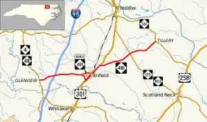 NC 481 is a two-lane rural highway that serves primarily as a farm-to-market route rather than as one to destinations other than Enfield. It begins at an intersection with NC 4/NC 48 in the community of Glenview, then proceeds east, quickly connecting with I-95 along the way. Near Enfield, NC 481 Business goes straight into the downtown area, while NC 481 meets U.S. Route 301 (US 301) before entering the town. After passing through town, it splits with US 301 north of Enfield and continues northeasterly. After connecting with NC 125/NC 903, it ends at NC 561 in the community of Tillery, near the banks of the Roanoke River.