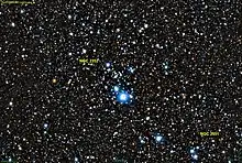 NGC 2353 is a loosely bound open cluster located in the constellation Monoceros. It has an apparent magnitude of 7.1[1] and an approximate size of 20 arc-minutes. The cluster is dominated by the magnitude 6.0 star HIP 34999, which lies at the southern edge of the cluster.
