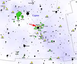NGC 6910 is located half a degree east-north east of Gamma Cygni, also known as Sadr. It may be physically related with the nebula IC 1318 (also known as the Gamma Cygni Nebula) as it lies at a similar distance, behind the galactic Great Rift. Cygnus OB9 is located within the Orion Arm of the Milky Way. Cygnus OB9's dimensions in the sky are 2.5 degrees by 1.5 degrees, which corresponds at its distance to 175×105 light years across. It includes many OB stars, along with supergiant stars, like the red supergiant RW Cygni.[7] Gamma Cygni is a foreground star, lying at a distance of approximately 1,500 light years.[8] Because it lies behind a number of molecular clouds, the light from NGC 6910 is dimmed by more than one magnitude.[9]