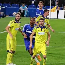 Maribor started their 2013–14 European campaign in the second qualifying round of the 2013–14 UEFA Champions League with a 2–0 aggregate victory over Birkirkara from Malta.[82] In the third qualifying round, Maribor eliminated APOEL on away goals rule,[83] securing their place in the play-off round for the second season in a row.[84] However, Maribor once again lost in the play-off round and continued their European season in the group stages of the Europa League for the third time in a row.[85] On 19 September 2013, the team played its first match in the group stage of the Europa League and were defeated by the Russian side Rubin Kazan.[86] On 24 October 2013, Maribor defeated Zulte Waregem 3–1 in Belgium, securing their first ever away victory in the Europa League group stages.[87] On 12 December 2013, Maribor defeated Wigan Athletic 2–1 and progressed beyond the group stage of a European competition for the first time, finishing second with seven points from six games.[88][89] In the Round of 32, Maribor played in a two-legged tie against the Spanish side Sevilla (who later won the competition) and lost 3–2 on aggregate.[90]