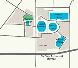 NRG Park, formerly Reliant Park and Astrodomain, is a complex in Houston, named after the energy company NRG Energy. It is located on Kirby Drive at the South Loop West Freeway (I-610). This complex of buildings encompasses 350 acres (1.4 km2) of land and consists of four venues: NRG Stadium, NRG Center, NRG Arena and the NRG Astrodome.