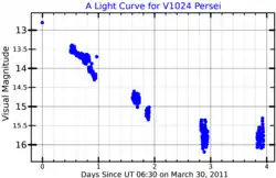V1024 Persei was initially named as Ross 4 in 1925, on the basis of photographic plates showing that it was much brighter in 1904 than in 1925.[4] Another outburst was observed in November 1948. A small outburst occurred on March 9–10, 2011 when it briefly reached about visual magnitude 14.5. A brighter outburst phase began and was observed on March 28, 2011 at visual magnitude 13.49 and confirmed at visual magnitude 12.8 on March 30, 2011. The object is typically fainter than visual magnitude 16.[1] In 2015, it was formally given the variable star designation V1024 Persei.[5]