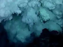 2 droplets were emitted prior to the extrusion of lava, which was itself accompanied by the emission of sulfur[20] and ash.[70] Turbid plumes similar to these in 2004 were observed again, initially obscuring the view of the seafloor. Presumably these plumes were caused by a collapse of the cinder cone.[18] - In 2009, the extrusion of lava was observed. It would slowly emerge from the vent, and blocks of lava would fragment and tumble down at the side of the vent. This process was accompanied by intense degassing, a yellowing of the plumes from sulfur[71] and emission of tephra.[72] A seismic swarm took place northwest of NW Rota-1 in April 2009 and was presumably caused by magma intrusion,[26] which may relate to the subsequent eruption.[73]